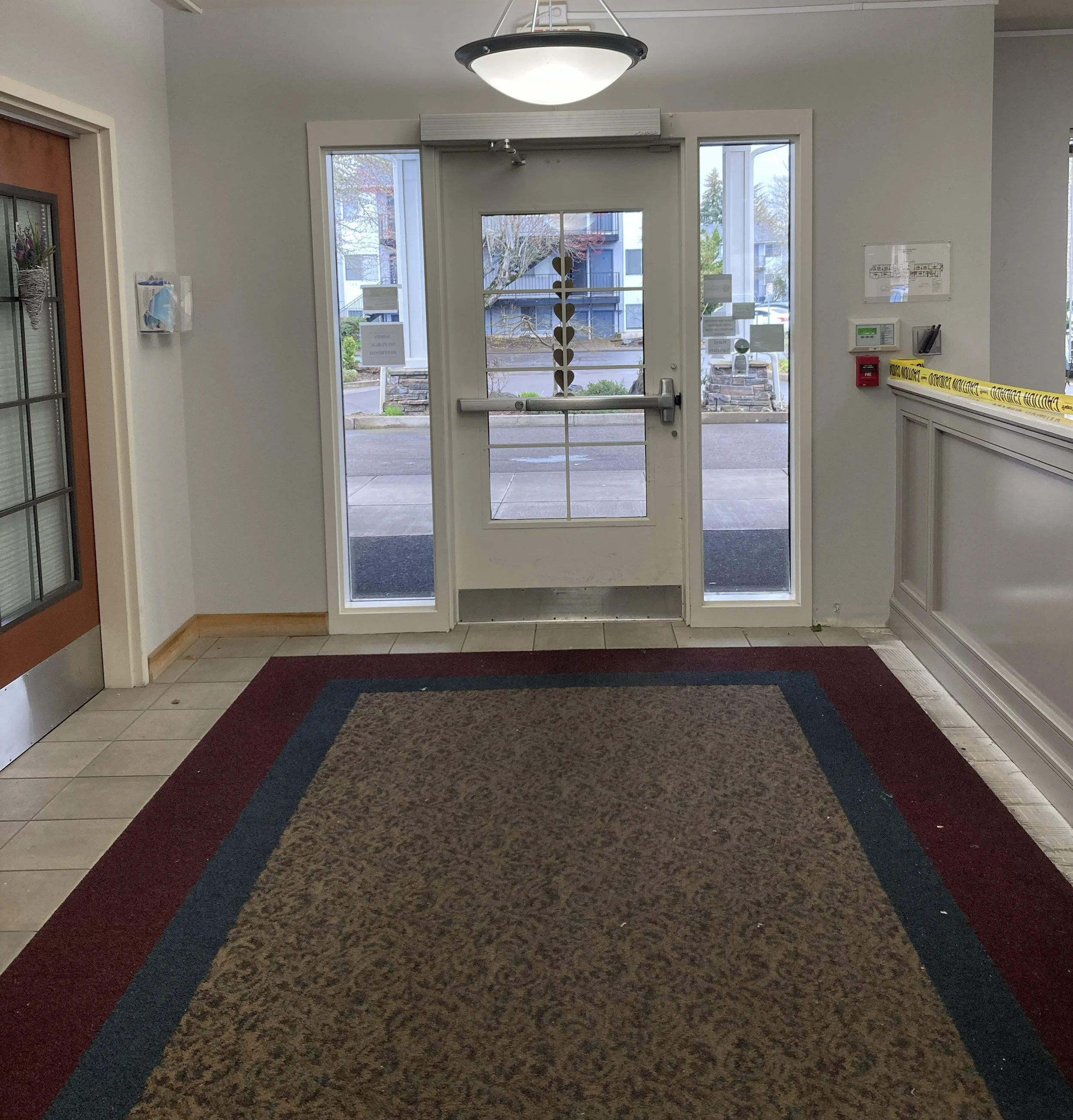 This image shows a carpeted entry surrounded by a narrow strip of tile. Although contrast between materials can be useful, this small tile perimeter creates an unnecessary transition. The high-contrast carpet border can also be misread as steps or level changes, adding visual confusion at the entry. Image by author.
