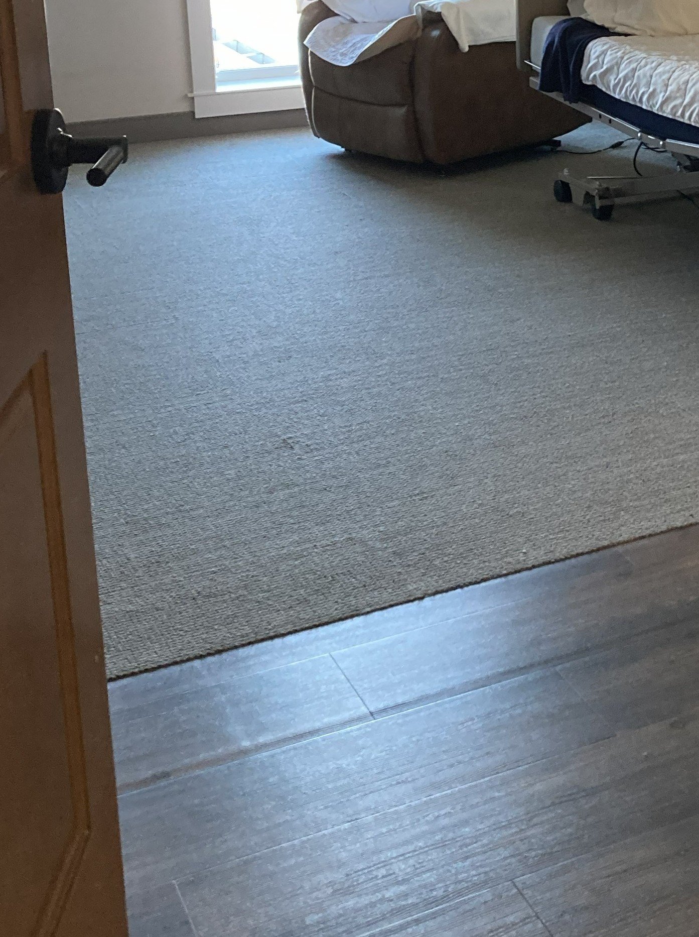 This image shows a low-profile transition between carpet and hard flooring. The color contrast helps signal a change in surface. Note the glare visible on the hard flooring, despite its matte finish. This illustrates how carpeting can help reduce glare at the walking surface. Image by author.