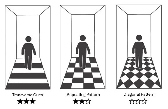 Regular, evenly spaced patterns can support gait by providing consistent visual stepping cues. Irregular or diagonal patterns are less effective. Strong contrast or certain pattern orientations may create visual illusions and should be used carefully.